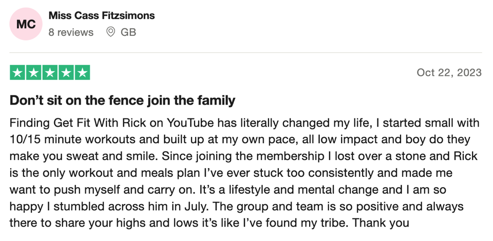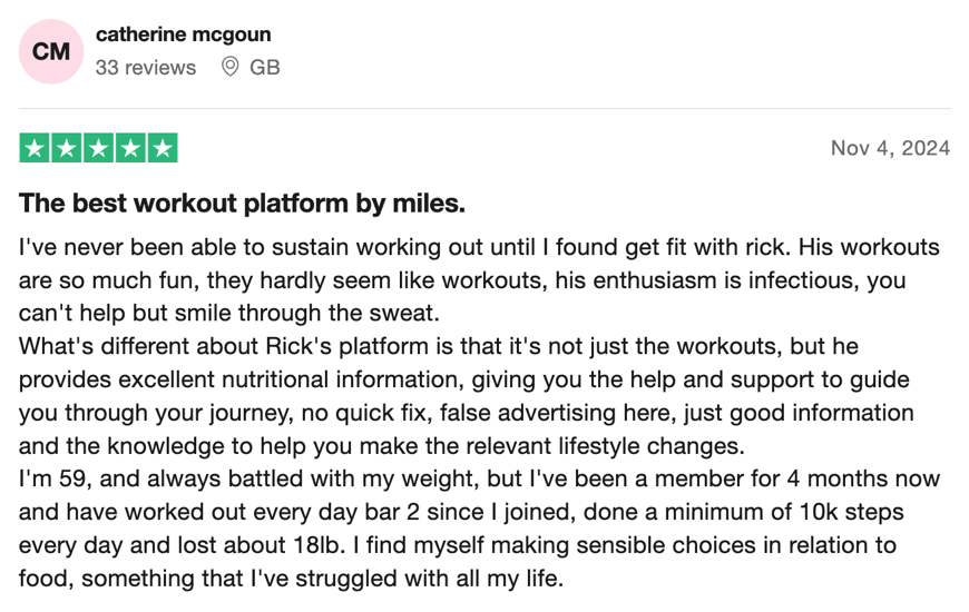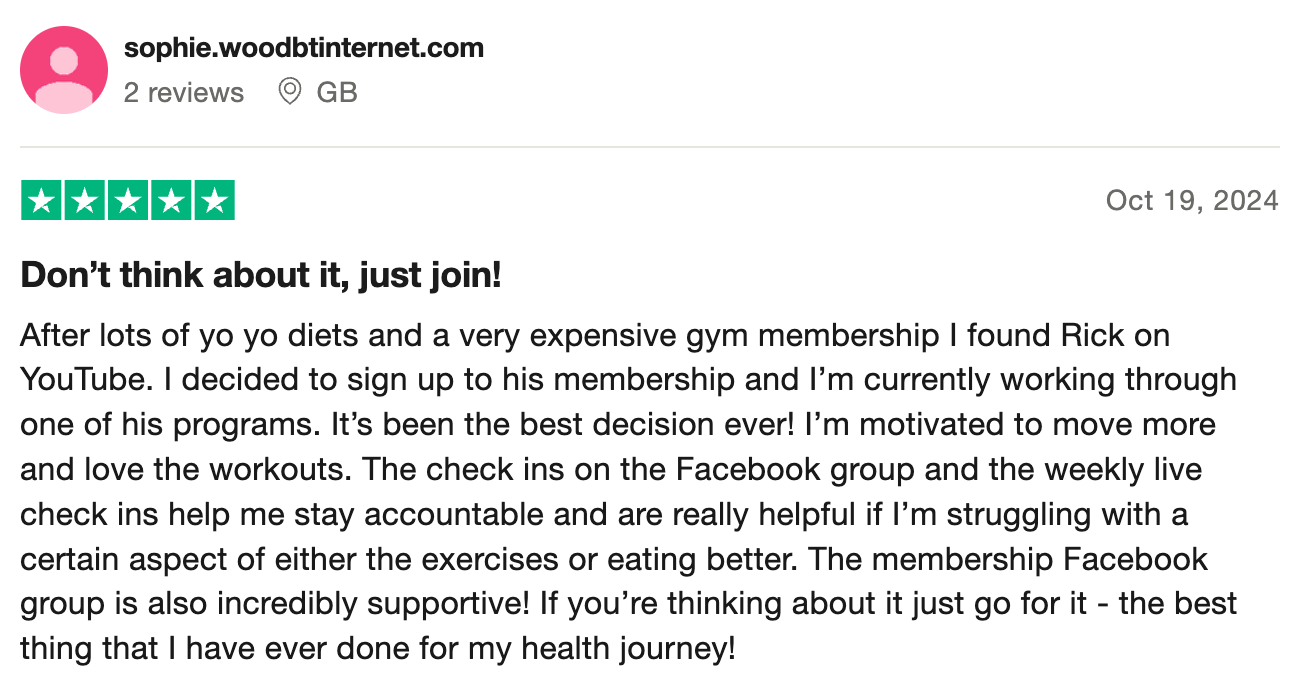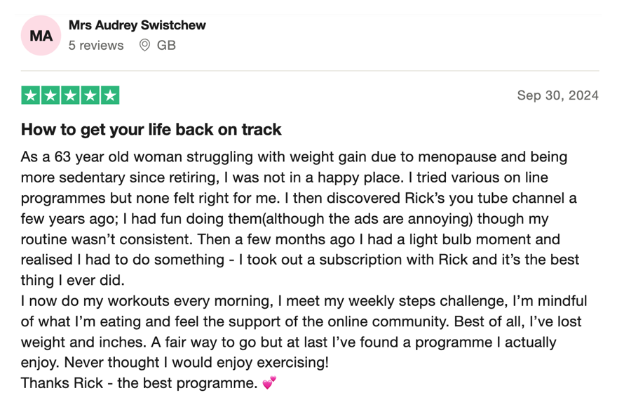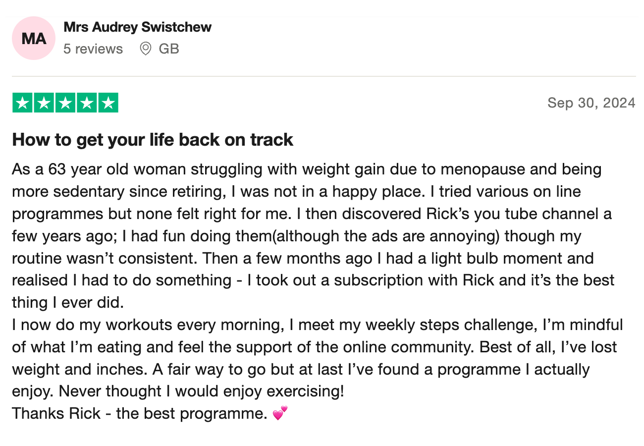 “100% recommend! Such a sense of community and support. All of Rick’s workouts both on YouTube and most importantly as part of his membership are FANTASTIC! I’ve recommended them to everyone and I know a few people who have passed the recommendation on even further too because of how much fun they all are!