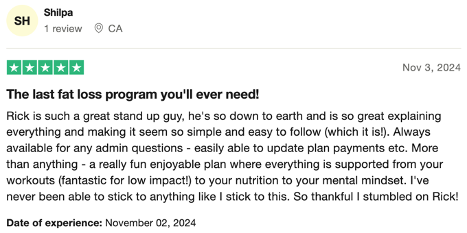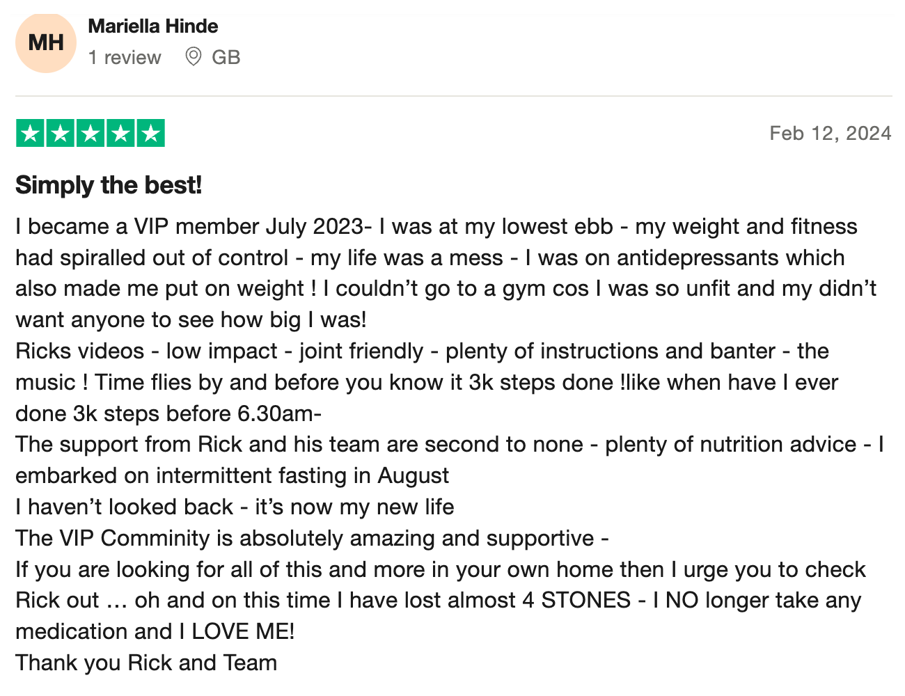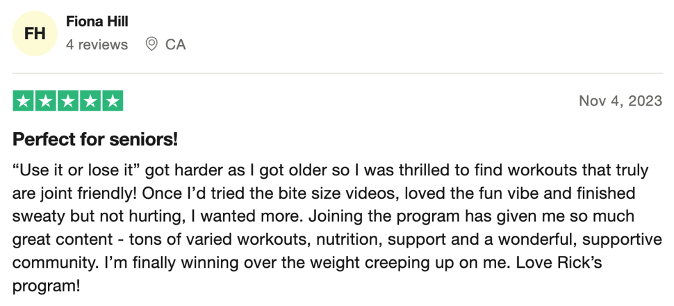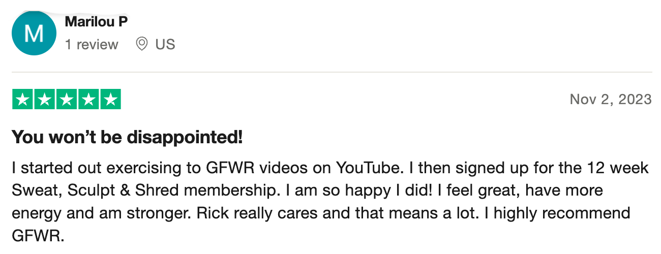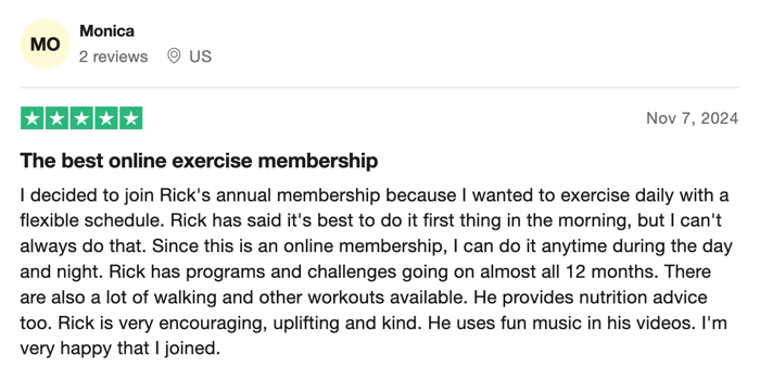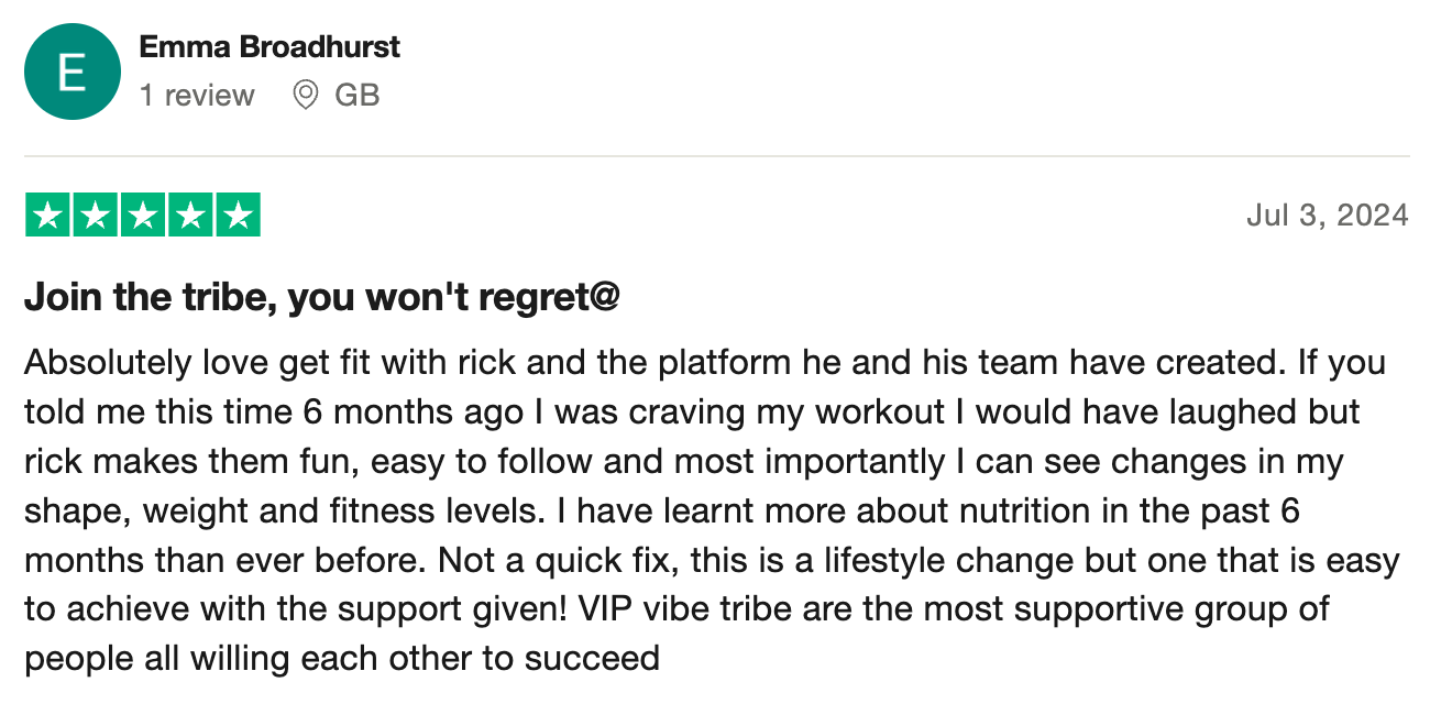 “100% recommend! Such a sense of community and support. All of Rick’s workouts both on YouTube and most importantly as part of his membership are FANTASTIC! I’ve recommended them to everyone and I know a few people who have passed the recommendation on even further too because of how much fun they all are!