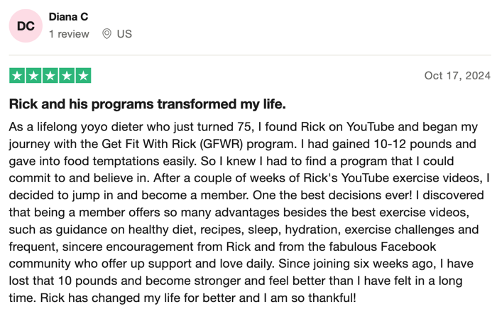 I have lost 30 pounds and have enjoyed every one of Rick's routines. In fact, I like them so much I decided to take out the membership! My outlook on life has changed dramatically and I am feeling better both mentally and physically. The routines are so easy even I can do them.”